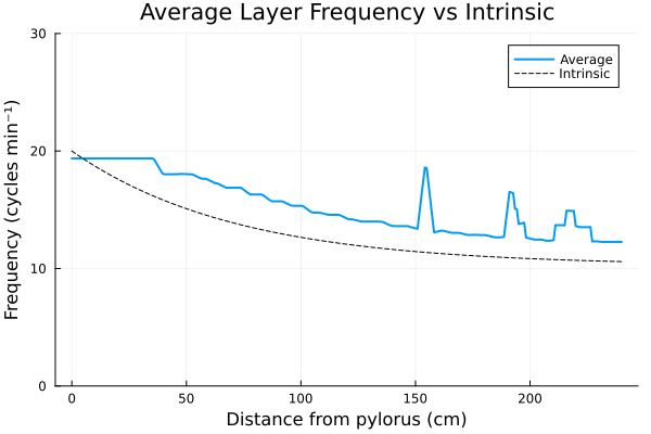 One of the key results of [2] is the ability of the model to simulate experimental observations (see [6]) - the figure below is obtained by averaging the frequency profile of the ICC and the LM layers along the spatial domain over 1000 seconds. The intrinsic curve represents experimental observations.