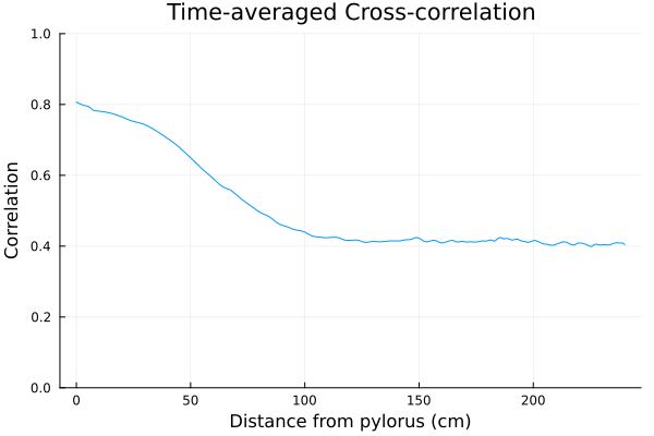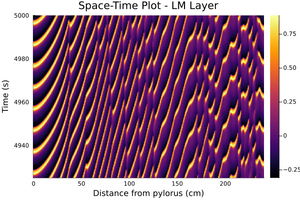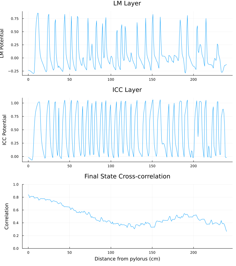The figure below is a snapshot of the electrical waveforms across the LM and ICC layers for the spatial domain of interest. One can already notice that the cross-correlation between the two signals tends to be lower as one gets further from the pylorus (the part of the stomach that connects to the duodenum, which marks the start of the small intestine).